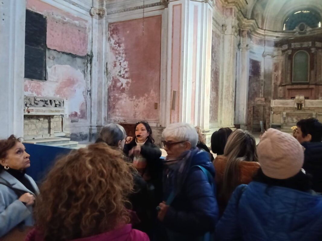 Accanto al mercato, i partecipanti hanno preso parte a una visita guidata all’ex complesso monumentale di Santa Maria della Vita, concepita come un vero e proprio percorso esperienziale di sostenibilità e consapevolezza dei luoghi. Dopo l’introduzione, il cuore della visita è stato l’intervento di Marinella Di Martino, che ha saputo trasformare l’attraversamento dello spazio in un’esperienza densa di senso.